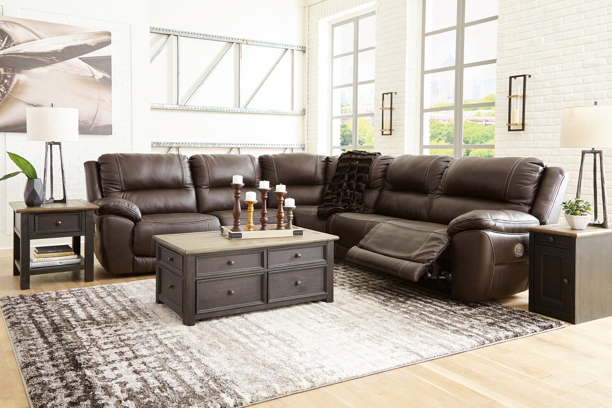 Load up on comfort in a cool, clean-lined and contemporary way with this power reclining sectional in chocolate brown. Rest assured, the expertly matched leather and faux leather upholstery is enriched with a pebble grain effect for authentic appeal and enhanced with jumbo stitching for dramatic contrast. It features a one-touch power control with adjustable positions, along with an Easy View™ adjustable headrest that allows a primo view of the TV even when you're reclined. Extended ottomans provide extra length for leg comfort. A zero-draw USB plug-in at your fingertips lets you charge up as you chill out.