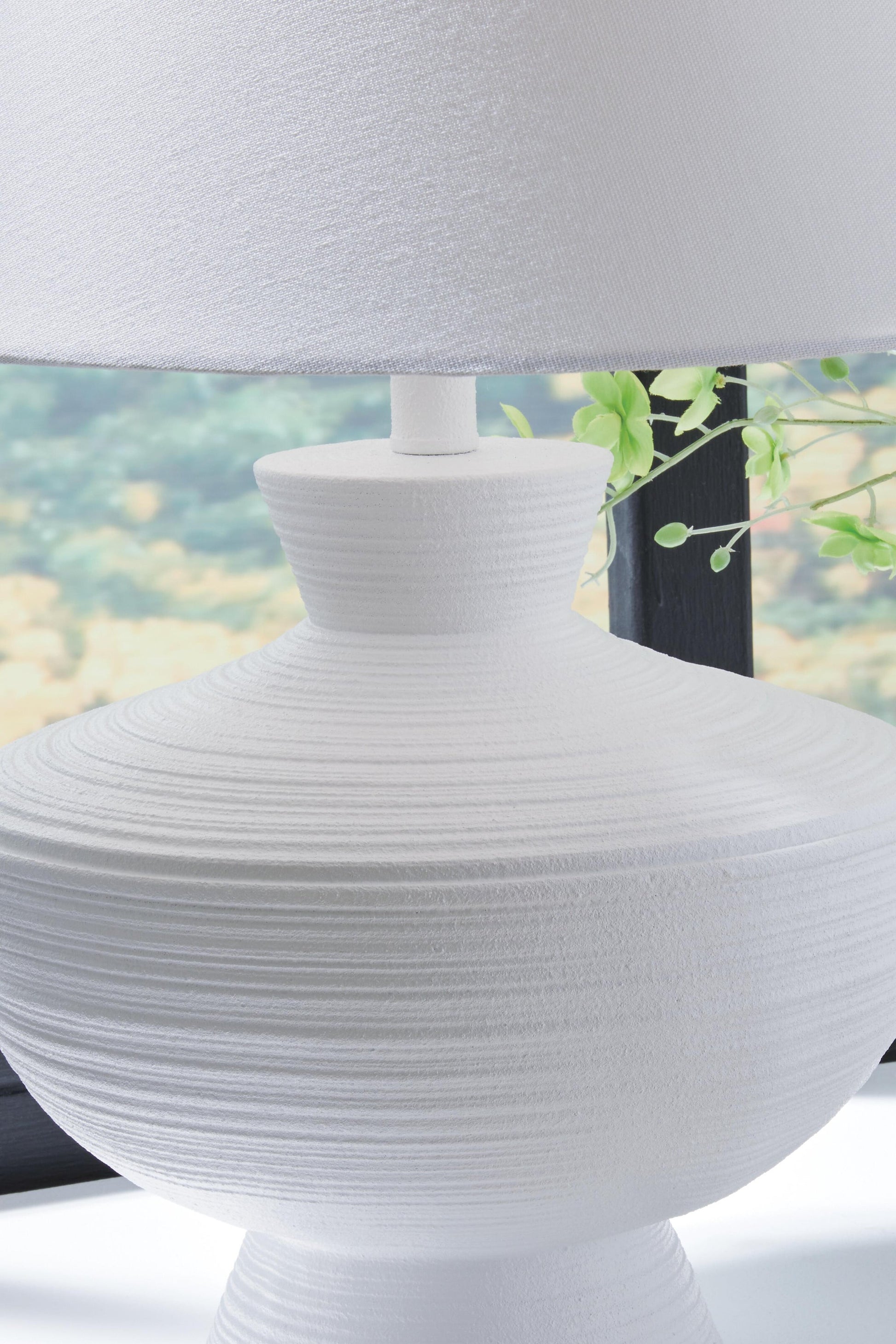 Cool, clean and contemporary. This table lamp's sculptural base is a forward-thinking approach to fashionable function. Complete with a crisp white finish and horizontal stripe details, the piece is a striking addition to a sofa-side or entryway table.