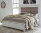 | Details | Includes queen upholstered headboard, panel footboard and rails, Made with solid wood, veneers and engineered wood, Distressed whitewash finish, Button tufted fabric upholstery, Nailhead trim, Foundation/box spring required, sold separately, Mattress available, sold separately, Assembly required | |